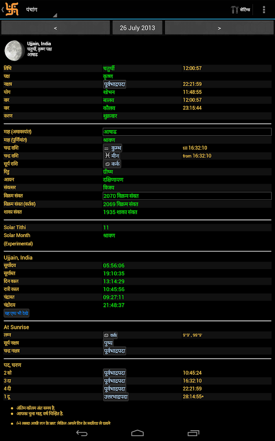 Panchang for any day. Tithi (date) along with paksha (shukla and krishna), yoga, karana, nakshatra and vaar (day of week). Also shows the year, maah (month purnimant and amavasyant),zodiac of moon and the ritu (Season), along with their end times. Has Vikram Samvat, Vikram Samvat Kartak and Indian National Calendar (Saka).